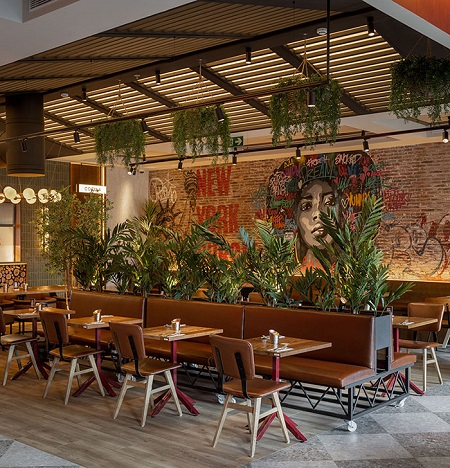 En este restaurante se puede quedar desde bien temprano -de lunes a sábado abren a las 8:30 y el domingo a las 10:00 h- para disfrutar de desayunos o brunch -disponible hasta las 13:30 h-; y seguir después con su gran variedad de hamburguesas al estilo neoyorquino, productos ahumados 100% caseros; parrilla -mucha, no olvidemos su lema de ‘brasa, madera y humo’-; una línea green y, en definitiva, una carta que va renovándose con el afán de gustar más que nunca. Es más, en NYB Caleido también hay cabida para el tardeo y las copas porque sin duda la zona y el local acompañan. Porque sin duda este restaurante nos traslada al corazón de la Gran Manzana a través de una atmósfera muy urbana con un aire industrial de los años 50 y las obras de artistas callejeros. Además, el espacio tiene distintos ambientes para cada momento del día y se abre al exterior mediante una gran fachada acristalada que permite esa conexión con los rascacielos.