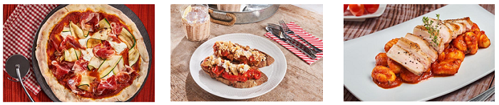Las recetas disponibles para la variedad de Orlando Creaciones Intensa, salsa de toque enérgico conseguido con hierbas mediterráneas y ajo asado, son: la pizza de jamón ibérico y calabacín, la tosta con ensalada de pimientos asados, y el secreto ibérico con ñoquis de patata.