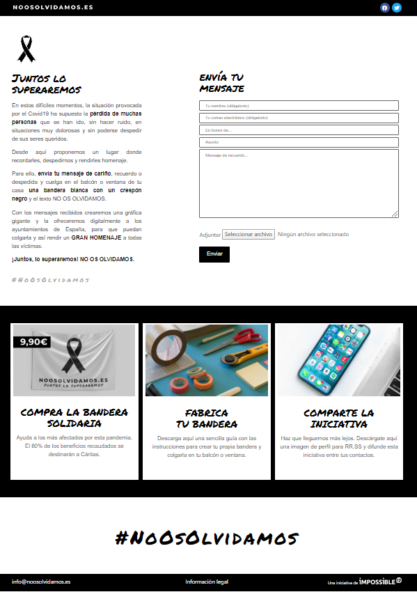 No Os Olvidamos es una página web (noosolvidamos.es) donde todos los ciudadanos pueden enviar su mensaje de cariño, recuerdo o despedida. Además, animamos a todos los participantes en la iniciativa a colgar en el balcón o ventana de su casa una bandera blanca con un crespón negro y el texto NO OS OLVIDAMOS. Con los mensajes recibidos se creará una gráfica gigante, que se ofrecerá digitalmente a los ayuntamientos de España, para que puedan colgarla y así rendir un GRAN HOMENAJE a todas las víctimas.