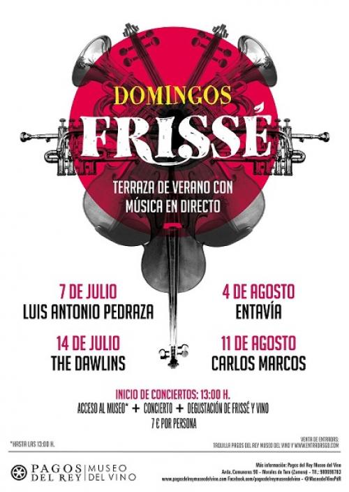 Pagos del Rey Museo del Vino repite, por quinto año consecutivo, su ciclo de programación más longevo. Domingos Frissé tomará la terraza del museo durante los domingos de julio y agosto para acercar artistas de prestigio regional y nacional hasta las instalaciones que la familia Solís gestiona en Morales de Toro (Zamora), en la D.O. Toro. El concepto de disfrutar de música en directo en la terraza y parte del jardín surgió en el año 2015 para dinamizar los mediodías de los domingos y se ha asentado como uno de los ciclos más especiales de la programación cultural del museo.