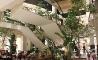 La zona exterior es un agradable espacio plagado de luz y parece estar inmerso en la naturaleza, gracias a la profusión de decoración vegetal con plantas, arbustos y cascadas de agua.