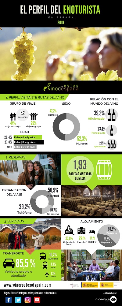 La mayoría de los enoturistas que visitan las Rutas del Vino de España lo hacen movidos por el interés en conocer un destino vitivinícola concreto (40%). Un 36,3% llegan a las Rutas como parte de sus viajes de ocio o de vacaciones. Otros aspectos que motivan el viaje son la gastronomía de la zona (5,7%), la cultura de los territorios vitivinícolas (5,3%) y la naturaleza (3,3%).