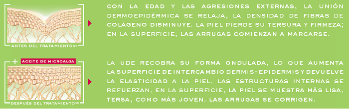 El aceite de microalga ha demostrado su actividad en 2 componentes esenciales para la juventud de la ude(1): las fibras de colágeno 4 (fibras de adhesión) se multiplican por 2,5, y la cantidad de laminina 5, proteína de anclaje, se multiplica por 3,4.