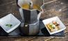 Si algo se nota en esta etapa es el esfuerzo y por descontado el cariño que los entusiastas socios le ponen a cada cosa que hacen. Conocen perfectamente la filosofía, las recetas y saben tratar a su público como se merece, de modo que la fórmula no puede fallar. Aunque a los fans y viejos conocidos les sonarán las elaboraciones de fusión iberoamericana, para los que entren por primera vez, cada plato de la carta puede ser una sorpresa por su ‘efecto transmutador’. Empezando por los entrantes, con La cafetera desestructuradora, también llamado Cardito Express, que como su nombre indica se sirve en una cafetera italiana pero en realidad contiene un caldo de pescado y mariscos que al hervir sube filtrándose con verduras y se sirve como un café. Otra preparación impactante son los Churros con chocolate, que en realidad son fritos de harina de maíz preparados para mojar en judías negras. El vistoso Temaki a la mexicana, cazón en adobo rebozado en harina de garbanzo y servidos en cucuruchos de lechuga o la Causa Oceanika, una ‘reconstrucción’ de pulpo a la gallega, que tampoco dejarán indiferente.
