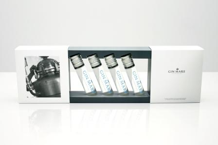 La colección "Botánicos Gin Mare", de cuatro tubos de ginebra de autor con aromas mediterráneos, requería de un estuche acorde. La empresa de Montornès del Vallés Durero Packaging creó un pack con apertura de doble corredera con freno, que es a la vez expositor, para poder colocar en ciertos establecimientos relacionados con el mundo de la ginebra. Imagen limpia y elegante y visión luminosa, dinámica y transparente del producto, que ha merecido un premio.