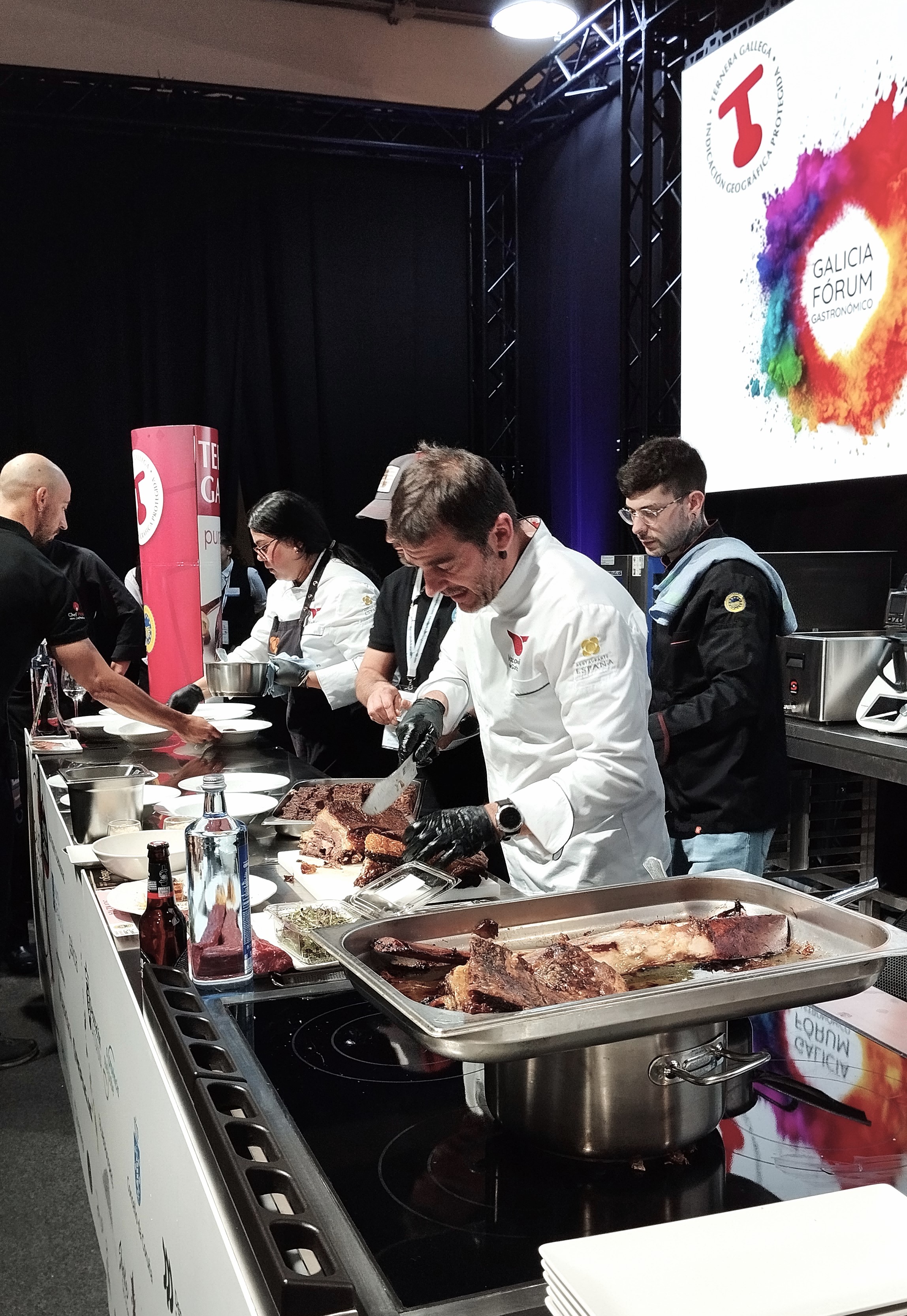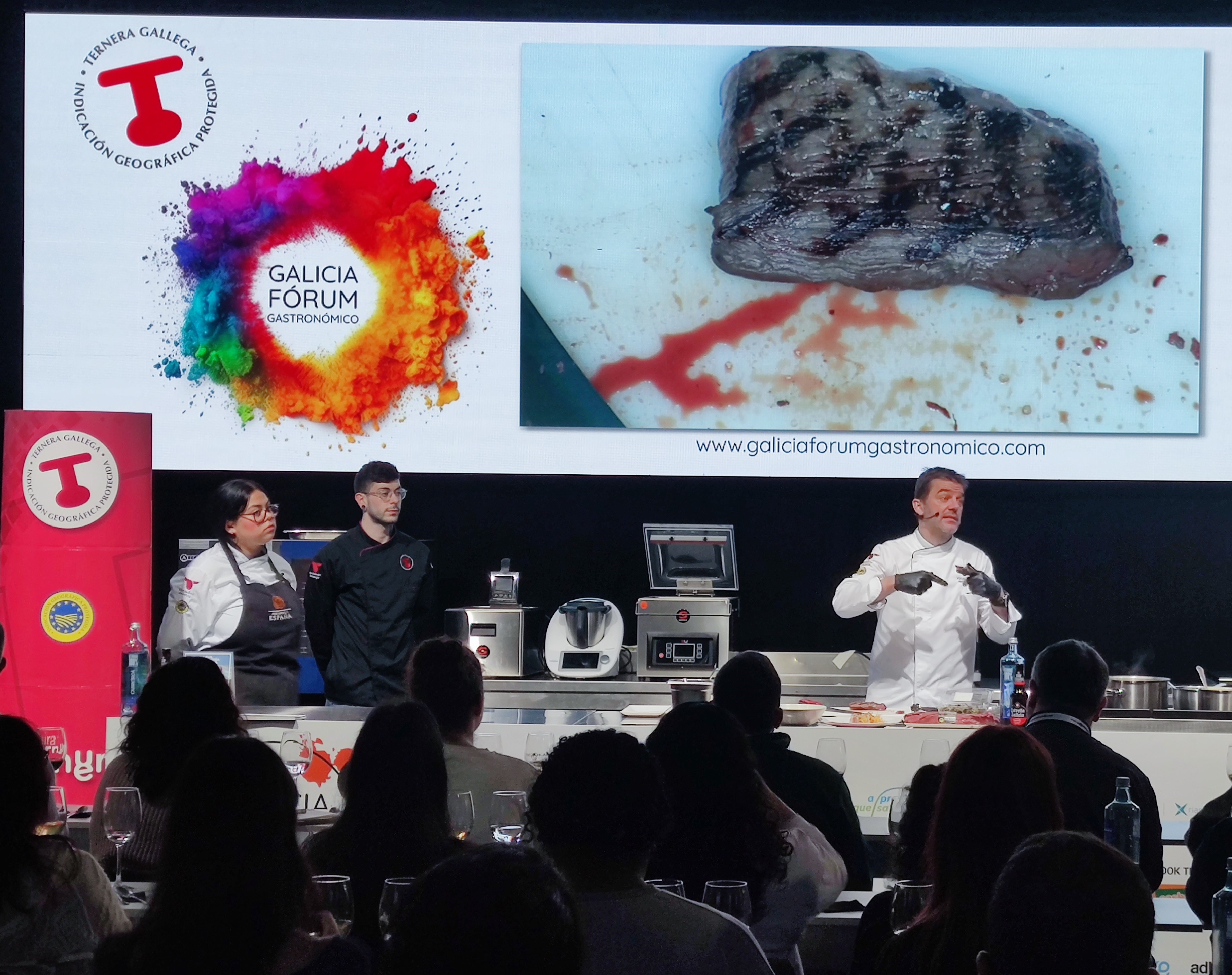 La IGP Ternera Gallega y la IGP Vaca Gallega-Buey Gallego formaron parte, una edición más, del Galicia Fórum Gastronómico, celebrado entre el domingo y este martes en A Coruña. Como plato principal, ofrecieron una masterclass, para unas 60 personas, dirigida por el cocinero del Restaurante España (Lugo), Héctor López, y el director de Promoción del Consejo Regulador, Luis Vázquez. Hasta seis piezas diferentes de ‘Ternera Gallega Suprema Ecológica’, de ‘Vaca Gallega’ y de ‘Buey Gallego Selección’ conformaron un menú que presentó nuevas recetas con un toque original.