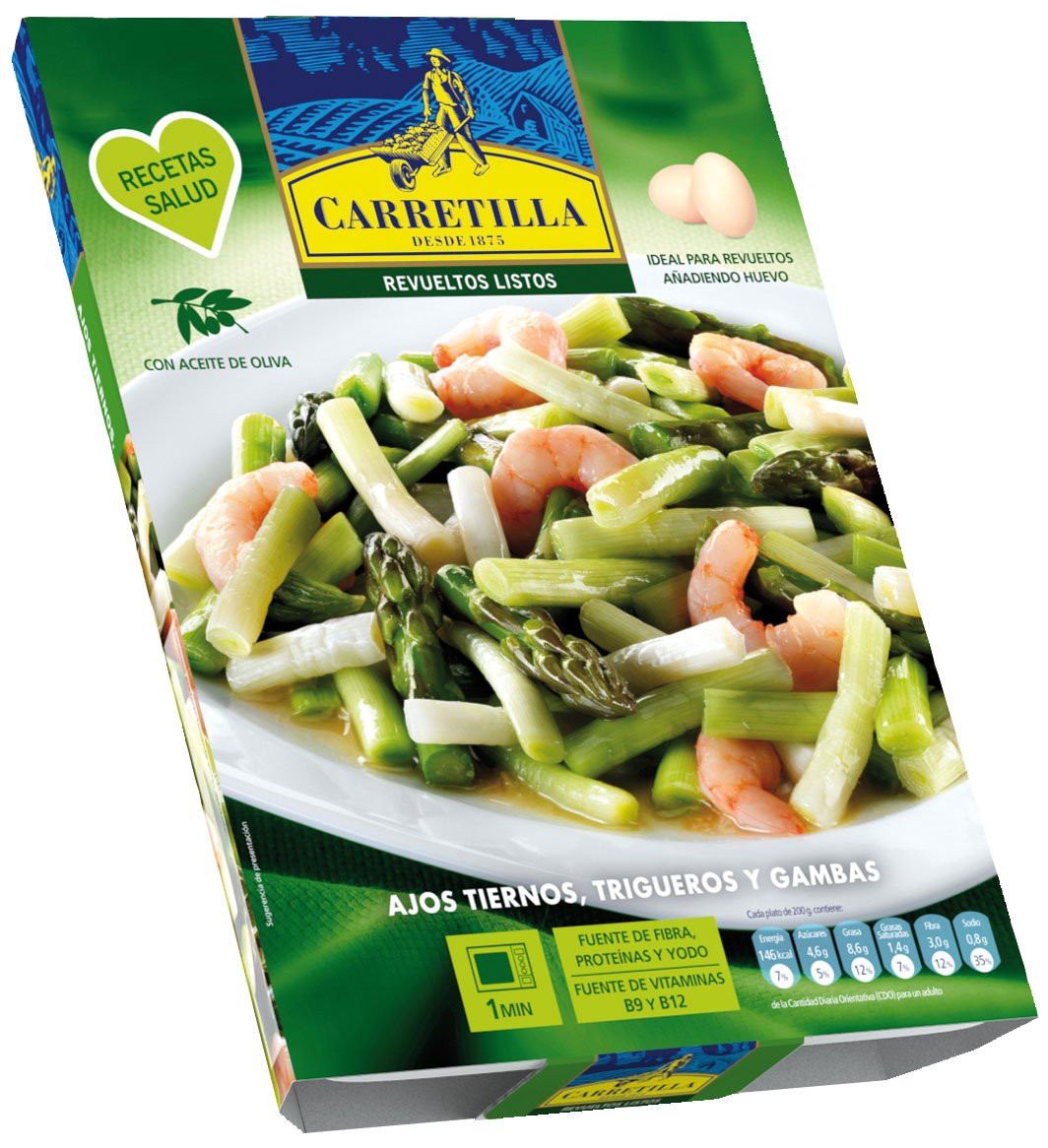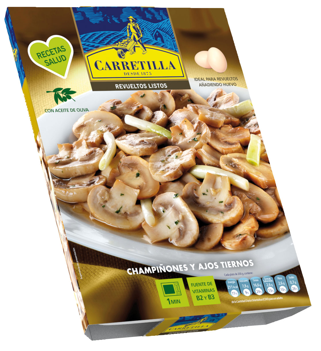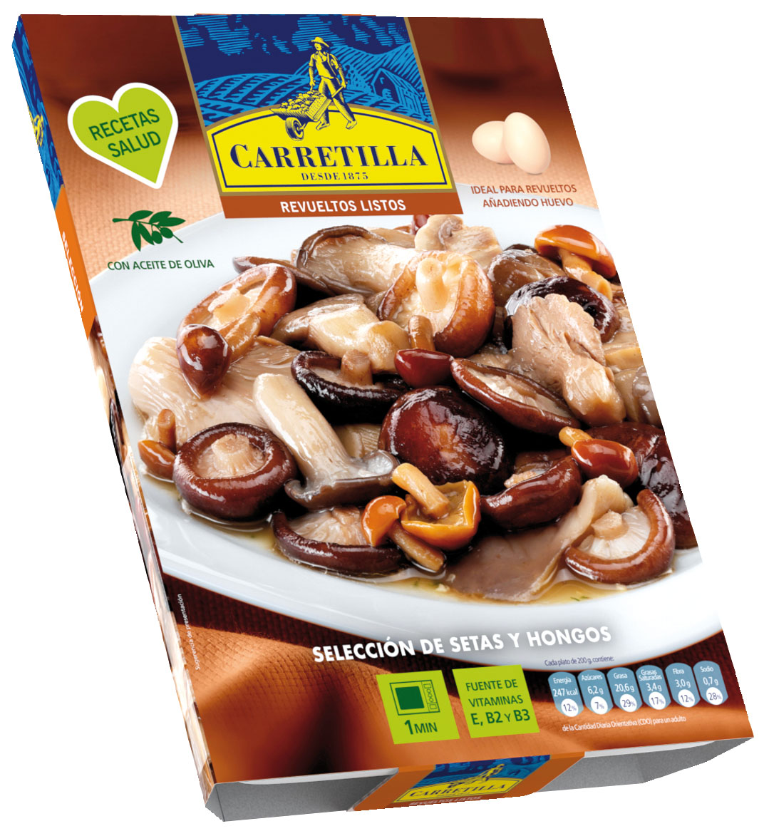 Grupo Alimentario IAN, continúa revolucionando el sector del plato preparado con Carretilla, para hacer la vida más fácil al consumidor. Carretilla lanza una nueva gama de tres Revueltos listos, cocinados con aceite de oliva y en su propio vapor, lo que garantiza un sabor y textura incomparables. Los revueltos listos Carretilla son recetas tradicionales de nuestra gastronomía, elaboradas como en casa: Selección de Setas y Hongos –con un toque de aceite de oliva, ajo y perejil-, Ajos tiernos, Trigueros y Gambas –una combinación deliciosa, como primer plato o en revuelto- y Champiñones y Ajos Tiernos –el complemento perfecto para infinidad de platos-. Son tan cómodos que resultan ideales para tomar solos, en revuelto o tortilla, o acompañando a carnes, pescados, arroz y pasta. Están listos con sólo 1 minuto en el microondas o 5 en la sartén, sin necesidad de añadir aceite ni sal. Además, sus envases contienen más producto en menos peso, eliminando el agua y aumentando el peso en crudo al máximo.