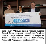 PepsiCo y sus empleados en España entregaron ayer a Educo un cheque valorado en 15.000€ para su programa Becas Comedor, cuyo propósito es garantizar, al menos, una comida completa al día en la escuela a niños de familias con pocos recursos. La recaudación, que se realizó mediante una campaña interna organizada por la compañía, equivale a 6.000 comidas completas.