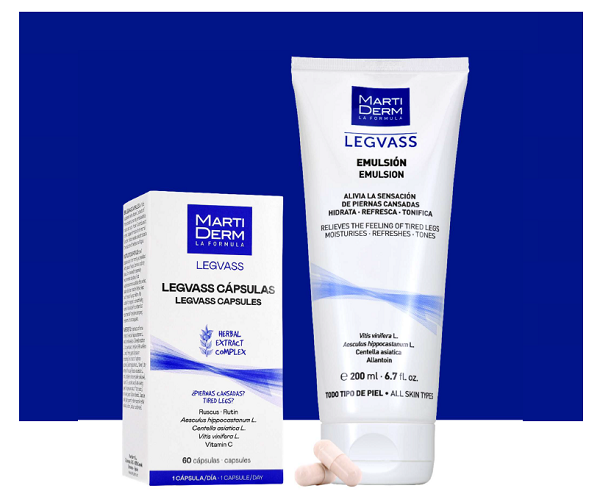MartiDerm LegVass ofrece una acción profunda desde el interior y a nivel tópico, dando una efectiva solución al problema gracias a dos productos cuya composición con bioactivos vegetales, actúan en sinérgia para combatir la insuficiencia venosa de las piernas, mejorar la micro-circulación y aliviar la sensación de pesadez, incluso durante el embarazo, y recuperar la ligereza y el descanso.