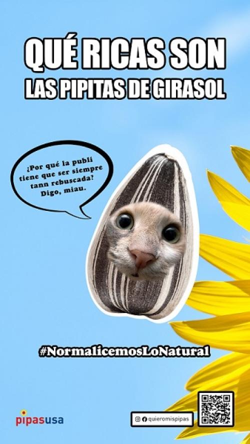 De esta manera, varias marquesinas situadas en puntos clave de la capital proyectarán durante el mes de junio a uno de los protagonistas por excelencia de las redes sociales de Pipas USA (@quieromispipas): El Gato-Pipa, que bajo el slogan “Qué ricas son las pipitas de girasol” critica la publicidad intensa y aboga por la naturalidad: “¿Por qué la publi tiene que ser siempre tan rebuscada? Digo, miau”.