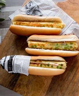 Sacar del agua, escurrir, desenvolver del papel con cuidado y meter entre dos panes de perrito tostados.