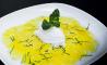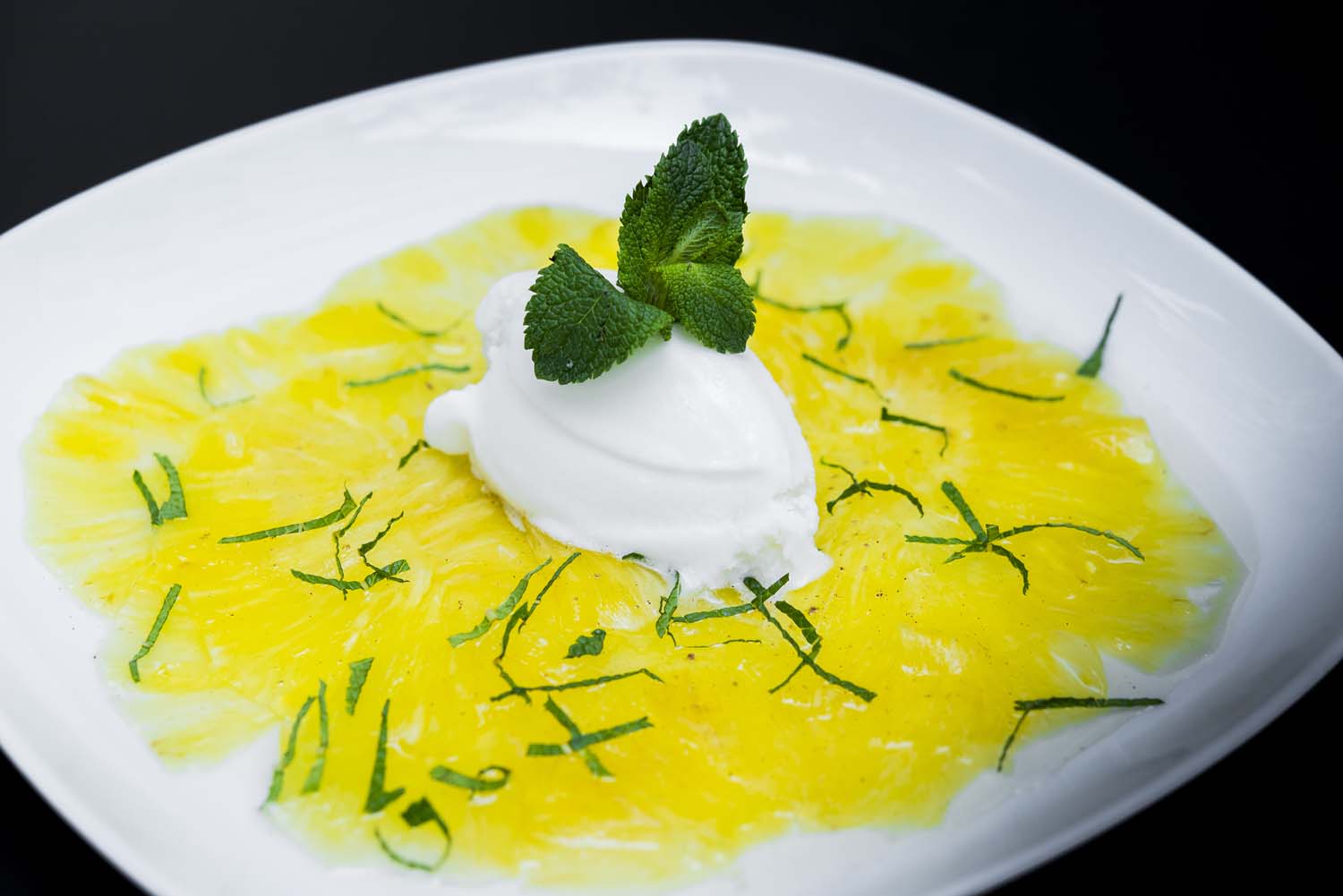 Carpaccio de piña en almíbar de Cointreau, pimienta negra y sorbete de coco-piña