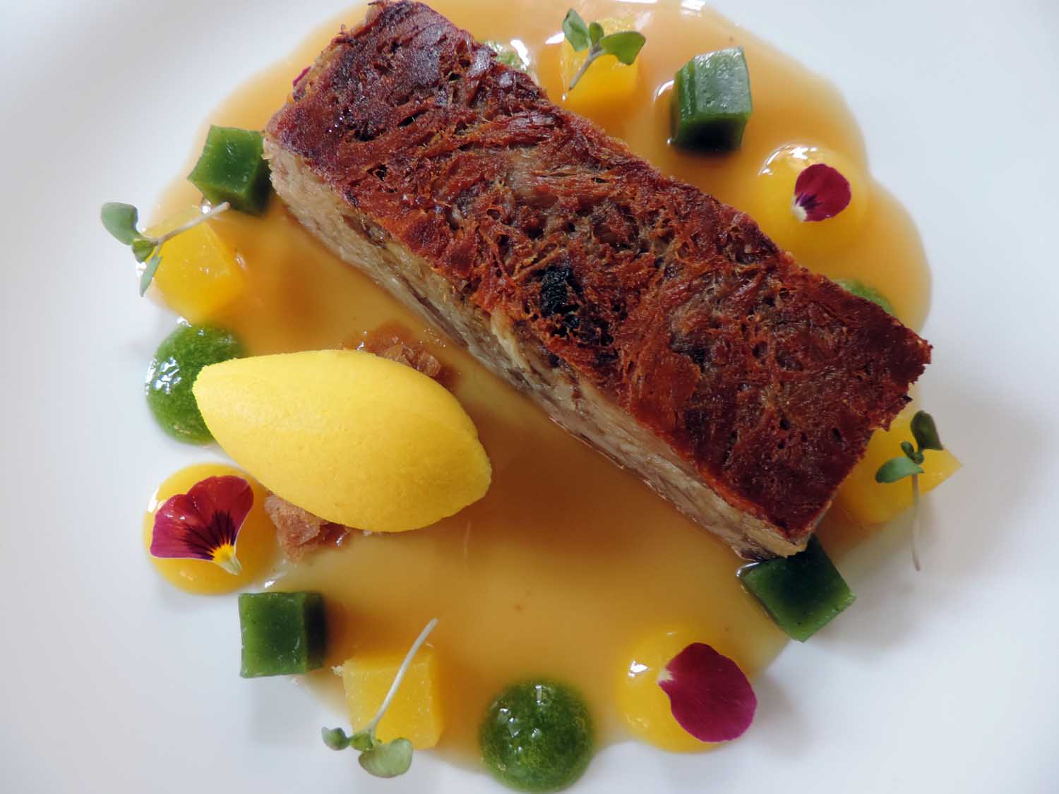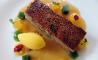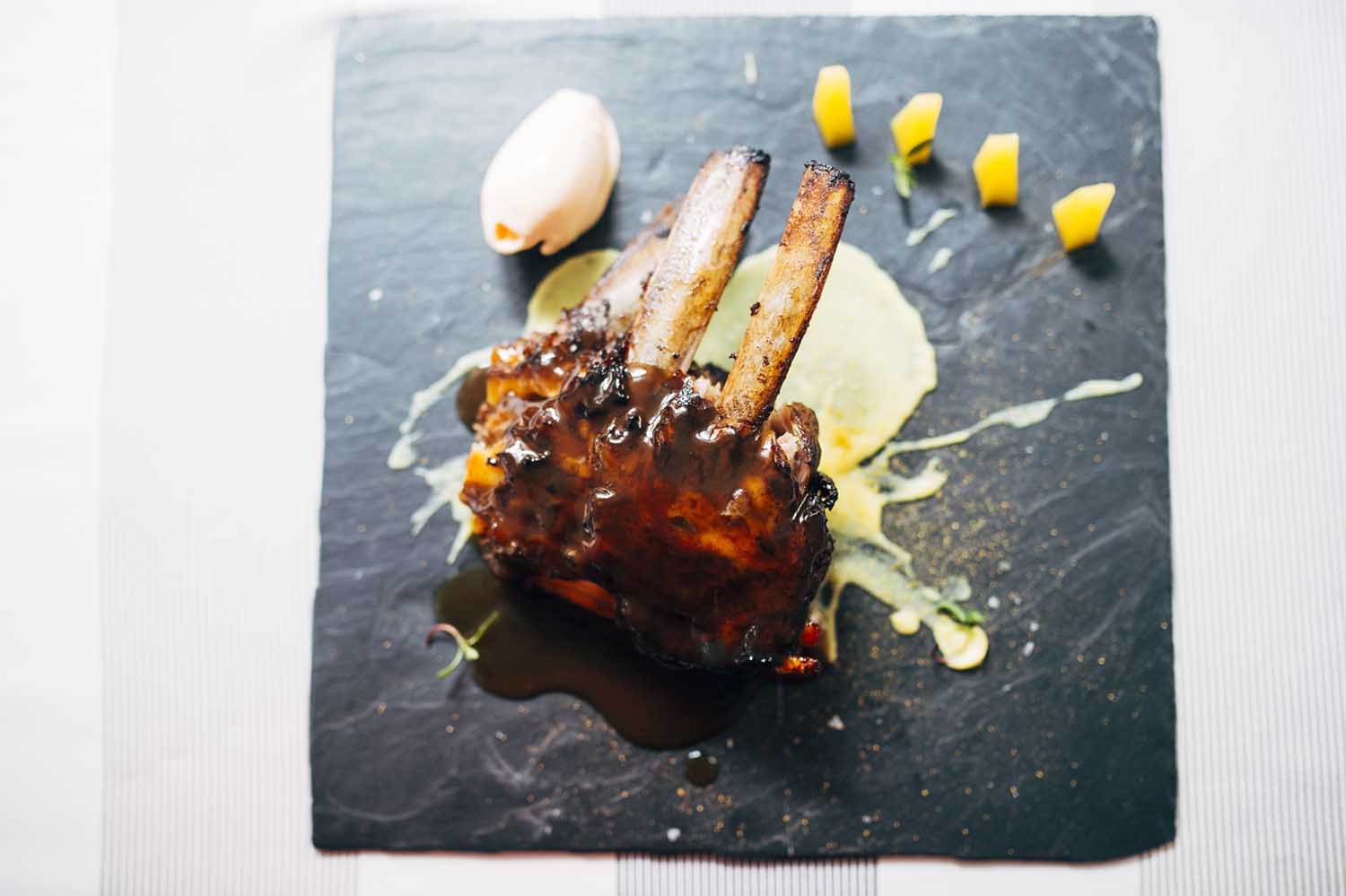 Lechazo asado al momento, mango, albahaca y helado de curry amarillo