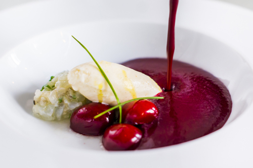 Gazpacho de cerezas con tartar de langostinos y helado de ginger