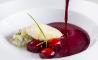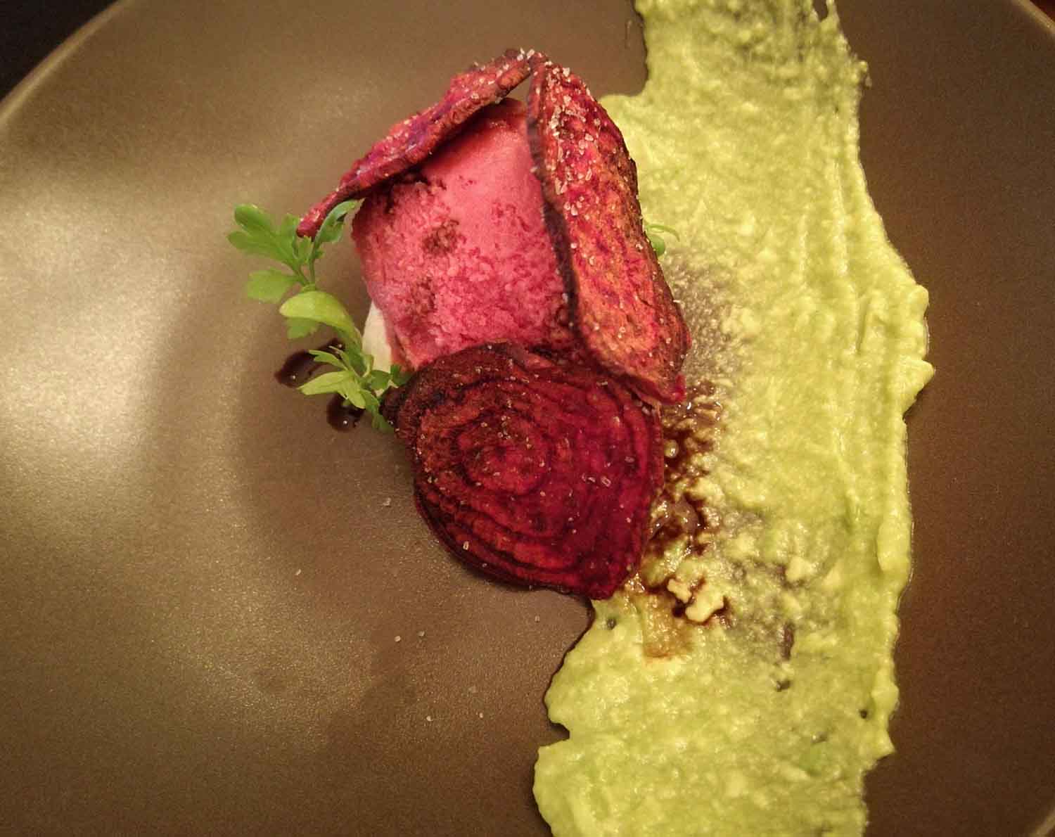Ensalada de queso bombón de San Martín de la Vega con mole y helado de remolacha