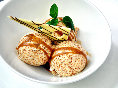 Helado de leche merengada, caramelo de canela y crujiente de almendras