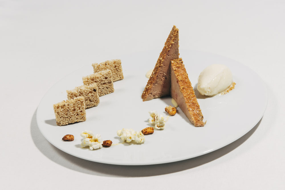 Terrina de hígado de pato de Villamartín con crema de maíz, kikos y helado de palomitas
