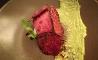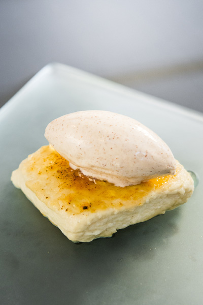 Torrija de sobao pasiego al lemon-grass y leche de coco con helado de yogur Búlgaro con grosella
