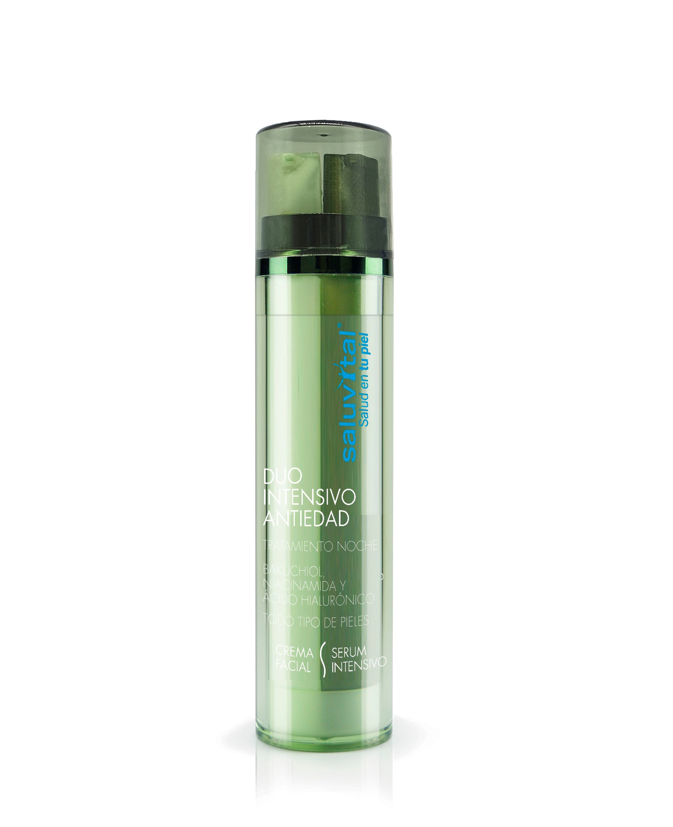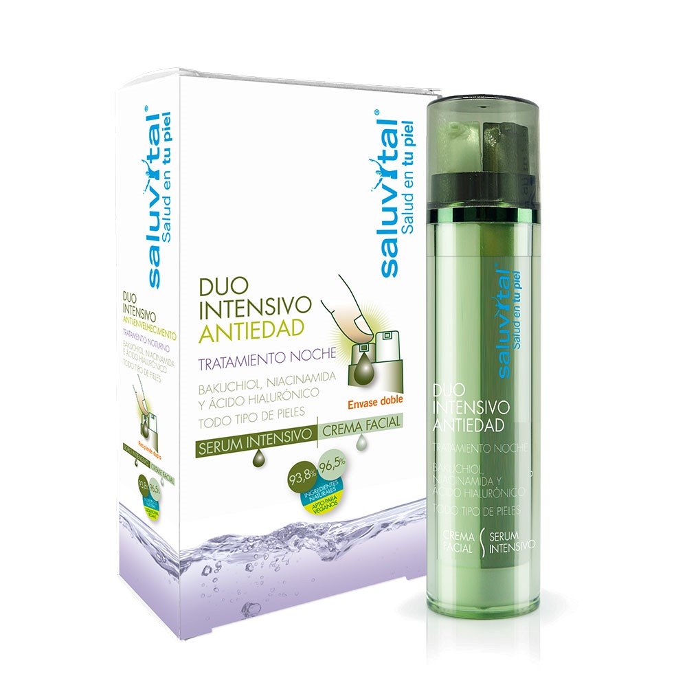 Saluvital lo sabe y, por eso, presenta su nuevo DUO INTENSIVO ANTIEDAD, apto para todo tipo de pieles, incluso las sensibles. Este tratamiento nocturno 2 en 1 está compuesto por una crema (con un 96,5% de ingredientes naturales), y un sérum (con un 93,8% de ingredientes naturales), con dosificadores independientes, redefine el concepto de cuidado reparador.