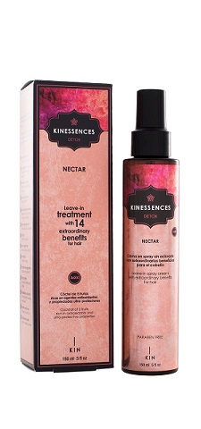 Kinessences detox nectar 14 en 1 es una crema en spray sin aclarado que protege, repara, aporta disciplina y le da una alta dosis de vitalidad al cabello.