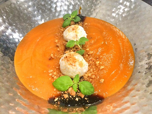 Calabaza confitada con queso fresco, piñones y su crema