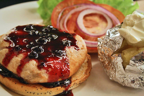 Hamburguesa de pavo con salsa de arándonos o de manzana y de acompañamiento puré de patata y ensalada de col.