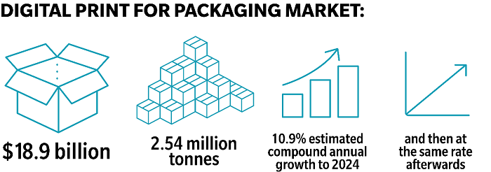 En 2019, Smithers valoró el mercado de la impresión digital para envases en 18.900 millones de dólares con un total de 2,54 millones de toneladas producidas. Se estima que el crecimiento será del 10,9% anual compuesto hasta 2024, y después al mismo ritmo. 2