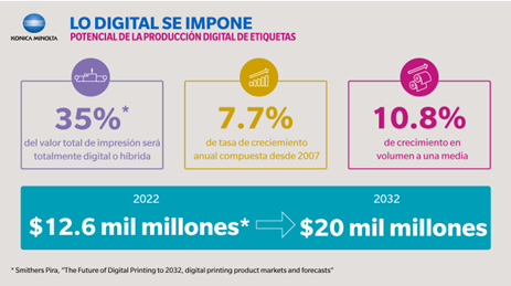 En un informe sobre las tendencias y los impulsores que dan forma a los futuros mercados de impresión digital, los analistas revelaron una cifra cercana al 35 % del valor total de la producción de etiquetas totalmente digitales o híbridas. Hace tiempo que lo digital ha llegado para quedarse. Según Smithers el mercado global de las impresión digilal de etiquetas tenía un valor de $12,6 mil millones en 2022, habiendo crecido a una CAGR (tasa de crecimiento anual compuesta) del 7,7% desde 2017, mientras que el volumen creció a un promedio de 10,8%.