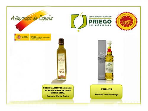 La empresa amparada por la Denominación de Origen Protegida “Priego de Córdoba”, S.C.A Olivarera La Purísima obtiene con su marca, “El Empiedro” el Premio Alimentos Al mejor Aceite de Oliva Virgen Extra de España en la campaña 2014-2015 en la categoría de Frutado Verde Dulce. De igual manera, ha resultado finalista, Almazara de Muela S.L, empresa amparada también bajo la D.O.P. Priego de Córdoba, para la elección al Mejor Aceite de Oliva Virgen Extra de España en la categoría de Frutado Verde Amargo. Reconocimientos que el Ministerio de Agricultura, Alimentación y Medio Ambiente concede cada año al mejor Aceite de Oliva Virgen Extra de cada campaña en sus diferentes categorías.