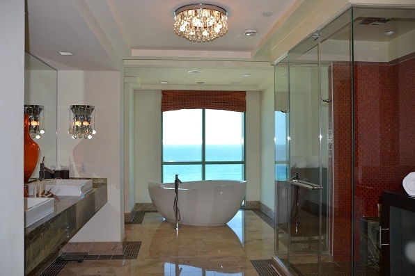 Los comensales al entrar al establecimiento son recibidos en un hall presidido por una grandiosa lámpara cilíndrica colgante realizada con cientos de peces blancos y dorados de cerámica, que giran con el viento, a modo de bienvenida. A la derecha nos topamos con un impresionante bar, cuya espectacular barra evoca una gran ola, invitando a los comensales a tomar un refrescante cóctel. En el comedor, unos grandes ventanales conectan el espacio con las playas de arena banca del resort, el increíble cielo bahameño y la exuberante vegetación.
