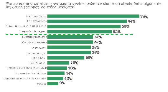 - Entidades financieras: a pesar de que los bancos y cajas registran los mayores índices de fidelidad en la población, sólo el 14% pertenece a un programa de fidelización, el 19% se siente satisfecho con lo que les ofrece y el 27 % lo usan normalmente.