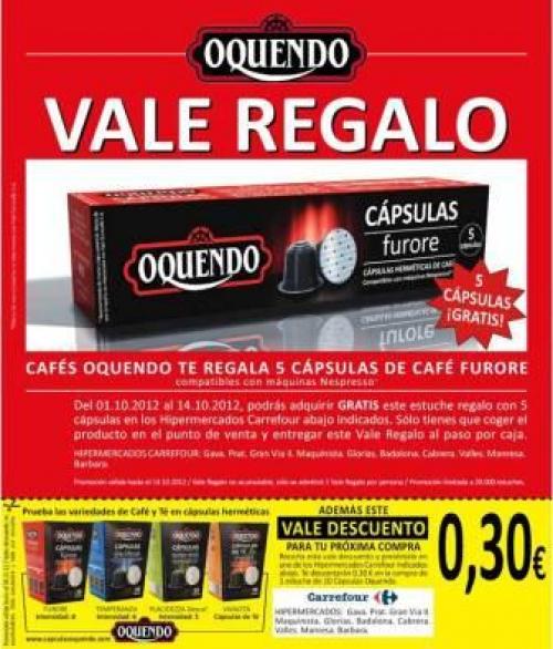 Además de llevarse sin coste un estuche de cápsulas, le obsequiamos también con un vale de 0.30 € como descuento en la compra de cualquiera de las variedades de cápsulas en estuches de 10 unidades Oquendo, que encontrará a la venta en estos hipermercados.