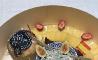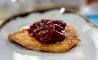Queso brie empanado con cebolla caramelizada y mermeladas de arándanos y tomate.