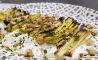 Unos puerros confitados a baja temperatura sobre una base de burrata, con un toque dulce de avellanas caramelizadas y cebollino.