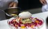Una ganache de albahaca y chocolate blanco acompañada con una quenelle de limón, jugo de cítricos y emulsión de mango. Un equilibrio perfecto entre lo dulce y lo cítrico.