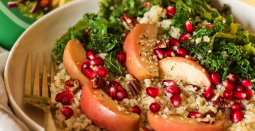 6. Coloca el trigo búlgur y las semillas de cáñamo sin cáscara en un plato. Cubre con el aderezo y mezcla suavemente. Agrega el kale, las manzanas asadas y las semillas de granada. Espolvorea con más semillas de cáñamo. Y ¡a disfrutar!