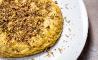 Tortilla de patata al momento poco hecha con trufa negra y huevos de corral