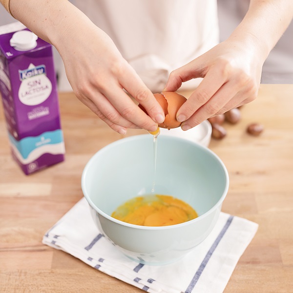 Casca los seis huevos en un bol y añade 100 ml de leche entera Kaiku Sin Lactosa, así como el perejil fresco y los 100 gr de queso emmental rallado Kaiku Sin Lactosa. Una vez volcados todos los ingredientes, salpimenta al gusto y bátelos.