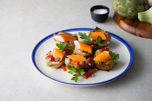 Ensalada de Krissia® y alcachofas Ingredientes para 2 personas 6 barritas Krissia® 6 alcachofas 25 g jamón serrano ½ cebolla roja 1 tomate de rama Perejil AOVE Sal y pimienta al gusto Elaboración