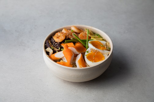 Ramen con caldo de marisco, Krissia®, gambas, cebollino y shitake Ingredientes para 2 personas 6 barritas Krissia® ½ l caldo de marisco 90 g fideos de arroz 100 g shitake 12 gambas 2 huevos 4 cebolletas tiernas Jengibre fresco Cebollino AOVE Un chorrito de sake/vino blanco Un chorrito de salsa de soja Sal y pimienta Semillas de sésamo. Elaboración
