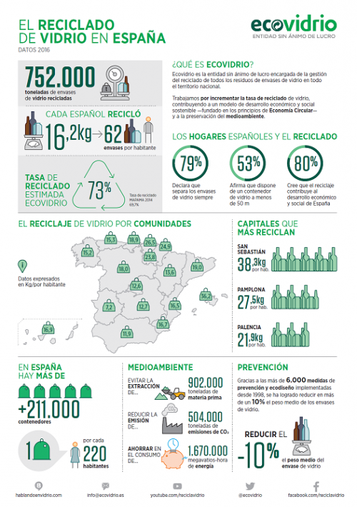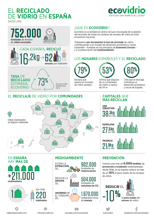 El reciclaje a través de contenedor verde sumado a los residuos reciclados a través de otras fuentes[1] permite estimar una tasa de reciclado de vidrio del 73% en 2016. Esto supone un incremento de más de tres puntos respecto a los últimos datos oficiales (2014) del Ministerio de Agricultura y Pesca, Alimentación y Medio Ambiente (MAPAMA), que sitúan la tasa en un 69,7%[2]. España se sitúa más de 10 puntos por encima de las exigencias que marca la Unión Europea (60%).