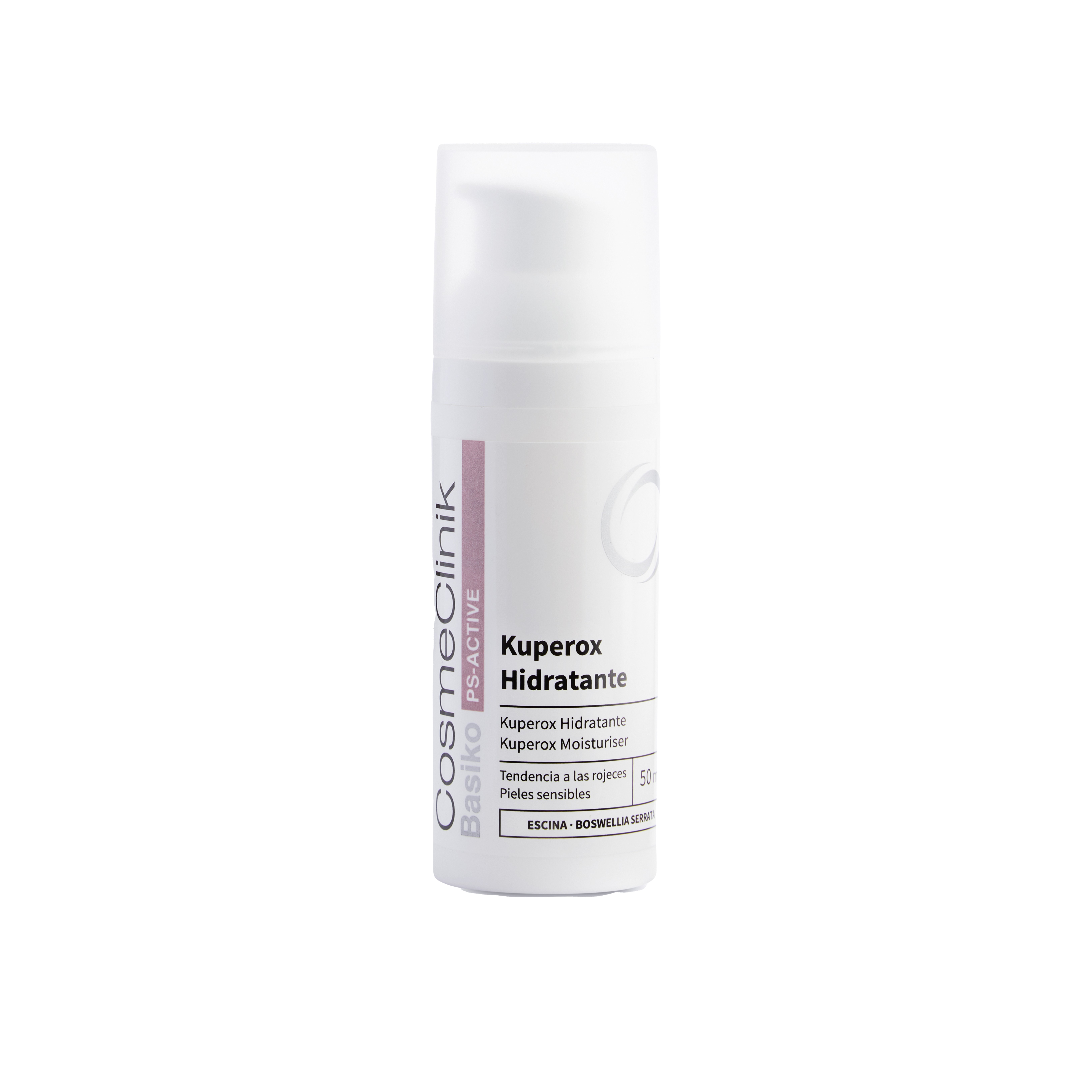 Basiko Kuperox Hidratante es una emulsión hidratante de textura ligera, rápida absorción y formulada sin parabenos ni perfumes alergénicos, lo que favorece su tolerancia en pieles sensibles y reactivas. Su uso continuado ayuda a prevenir y atenuar las rojeces, además de reforzar las defensas cutáneas frente a los factores desencadenantes de la rosácea.