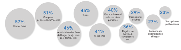 A pesar de las evidentes señales de incremento de confianza, el sentimiento de inseguridad financiera sigue afectando a los hábitos de consumo y de estilo de vida de los españoles. Así, según se desprende de la encuesta, en el momento de recortar gastos en últimos 12 meses los españoles se decantaron por comer menos fuera de casa (57%), limitar las compras (51%), reducir las actividades de ocio fuera del hogar (46%) y disminuir los viajes (45%).