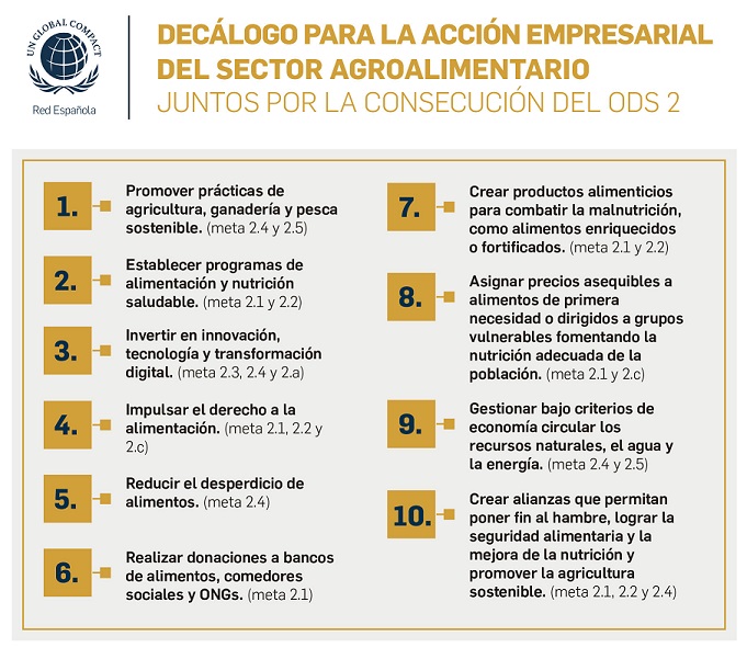 Para ayudar a las empresas del sector agroalimentario a dar el paso hacia la realización de iniciativas que contribuyan a este ODS, la Red Española del Pacto Mundial ha elaborado un decálogo de acciones al que suman ejemplos de prácticas que impactan en cada una de las metas de este Objetivo y que son aplicables a todo el sector:
