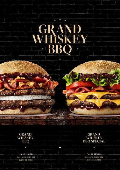 Grand Whiskey BBQ regresa a Burger King® para sorprender a los paladares más exquisitos, en respuesta a su exitoso lanzamiento del año pasado. La receta original, de la primera hamburguesa premium de la compañía, destaca por ofrecer una combinación insuperable de sabores. El diseño de esta hamburguesa se caracteriza por el novedoso pan de cerveza y el delicioso queso de cabra que marida a la perfección con la salsa Whiskey BBQ (su ingrediente estrella). Esta edición limitada cuenta con la opción de elegir entre la clásica carne a la parrilla o la variedad de pollo Tendercrisp®.