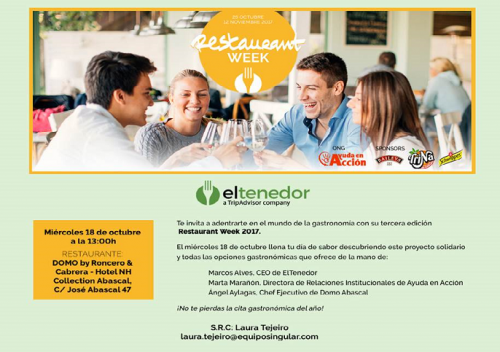 Tras el éxito de la última edición, la alta gastronomía de Madrid, Barcelona, Valencia y, esta vez también la de Sevilla y Málaga, muestra su cara más solidaria en la tercera edición de Restaurant Week organizada por ElTenedor, la app líder de reservas online de restaurantes en Europa. Esta vez será del 25 de octubre al 12 de noviembre y participarán más de 300 restaurantes de primer nivel que, durante estos días, ofrecerán menús de lujo por sólo 25€ con el objetivo de acercar la alta gastronomía a todos los públicos y colaborar con una buena causa. Veinte días llenos de sabor en los que lo comensales podrán disfrutar de restaurantes premiados con Estrella Michelin, platos elaborados por grandes chefs o de los locales de moda del momento a precios asequibles, simplemente reservando a través de la app ElTenedor.