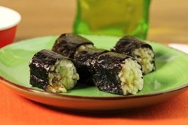 4- Humedecer los bordes de la lámina de alga, colocar el arroz y el pepino en uno de los extremos del alga y cubrirlo con la mermelada de naranja