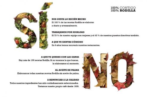 Rodilla, cadena de referencia en restauración informal, artesana, saludable y de calidad nacida en 1939 ha lanzado esta semana su nueva campaña corporativa “100% contigo, 100% Rodilla”, que tiene como pilares la elaboración diaria de sus recetas, la igualdad de género en la compañía y la sostenibilidad en sus productos y procesos.