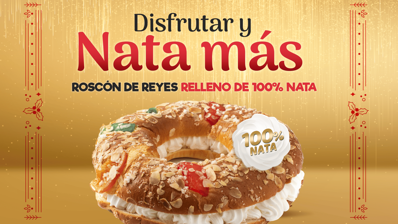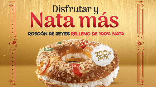 Una receta con masa madre, mantequilla y 100% nata, sin aceite de palma. ‘Disfrutar y nata más’ es el eslogan bajo el que la compañía presenta el roscón de Reyes en el punto de venta.