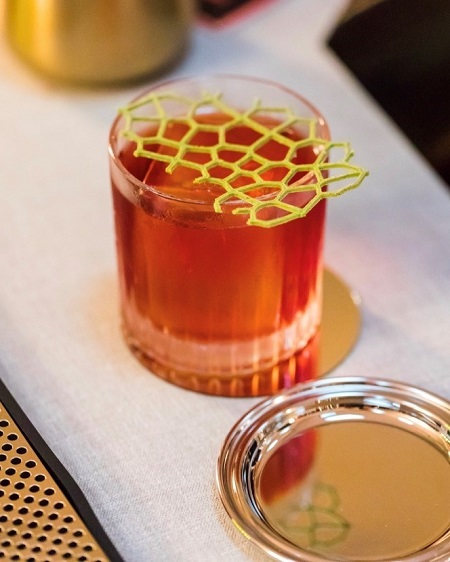 De nombre Bon Vivant Negroni, Giorgio Zannini versiona la original receta añadiendo ginebra Bulldog infusionada con hojas de higo, vermut rojo Cinzano 1757 y Campari. Para jugar con el amargor y el toque afrutado, contiene un sherbet de fresa y perfume de hojas de higo, y como decoración, un coral de aceitunas salado y crujiente.
